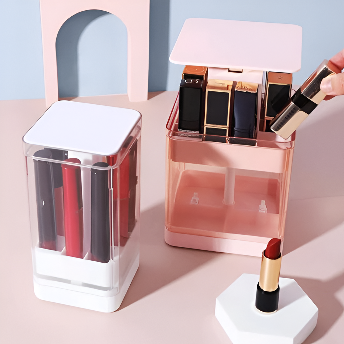 Nuestra caja asegura que tus labiales estén protegidos de polvo y daños, con capacidad para varios labiales, maximiza el espacio en tu escritorio.