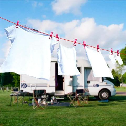 Nuestra cuerda de tela para secar ropa tiene clips / clavijas de 12 piezas con gran fuerza de sujeción para sujetar la ropa de forma segura, incluso con vientos fuertes.